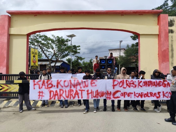 Masa membawa spanduk bertuliskan “Konawe Darurat Hukum” Dan “Reformasi Polri Tidak Sampai Ke Polres Konawe”. Pernyataan tersebut didasari oleh ketidak puasan masa terhadap kinerja Kasat Reserse Kriminal (Reskrim) beserta jajarannya dalam menangani kasus tangkap tangan perjudian (Sabung Ayam), melalui Operasi Sikat Anoa 2025 di kecamatan Amonggedo.